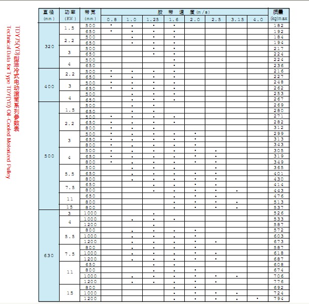 該產(chǎn)品是DT型、DTⅡ型通用固定式膠帶機的內(nèi)驅(qū)動裝置,其內(nèi)部采用定軸齒輪二級傳動,屬于老產(chǎn)品,但用途最廣泛,與減速機相比較,具有占地小、重量輕、外觀整齊、效率高,在粉塵大、潮濕泥濘的惡劣環(huán)境下仍能正常工作等優(yōu)點。隨著電動滾筒的不斷革新與技術(shù)進步,根據(jù)需要也可以制成三級減速(0.08-0.63米/秒之間的低帶速),以滿足用戶之要求。