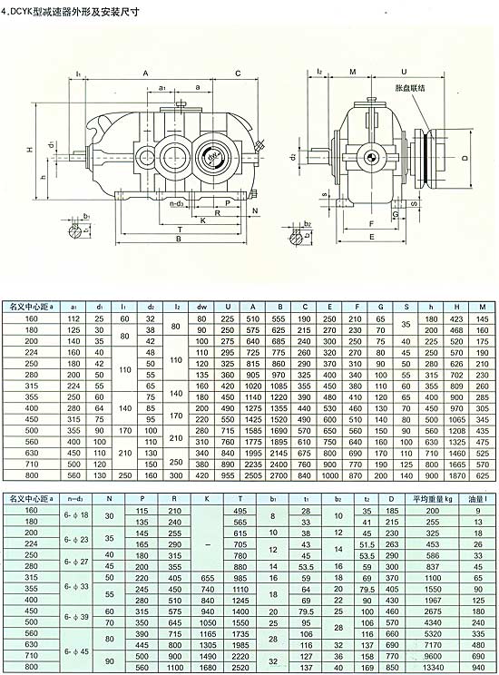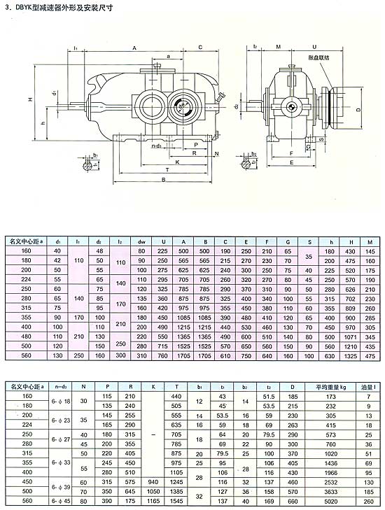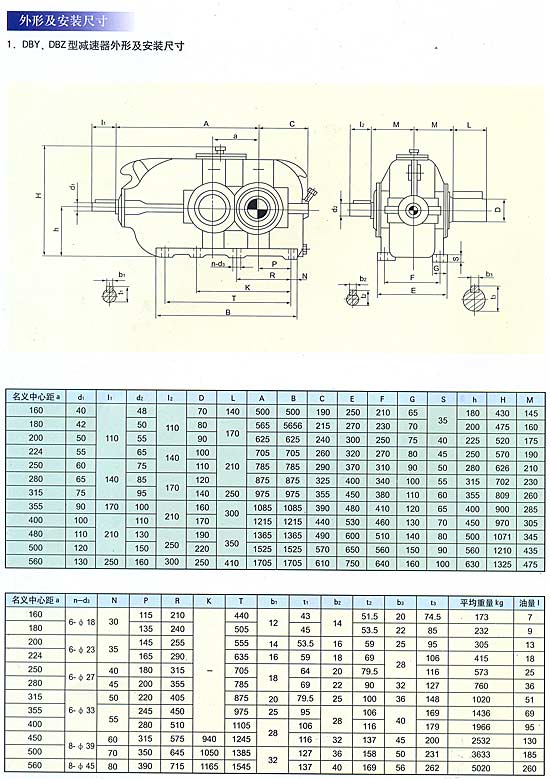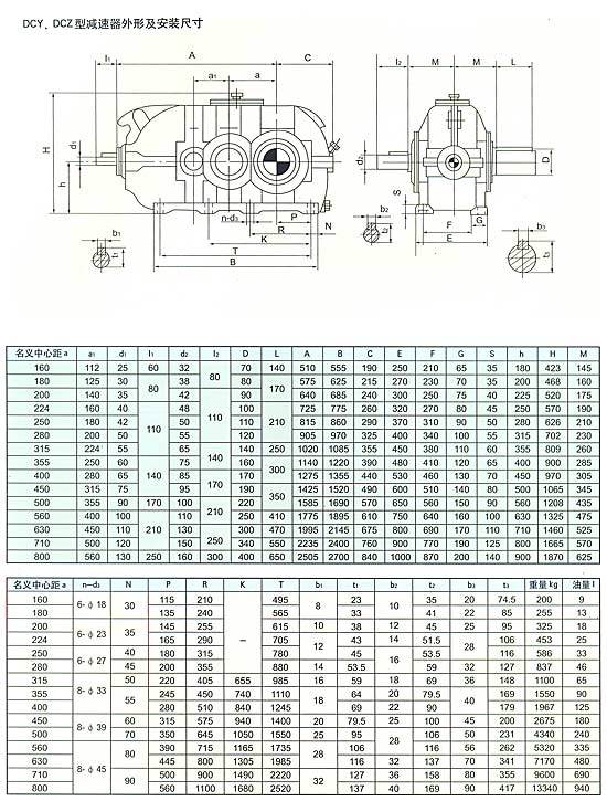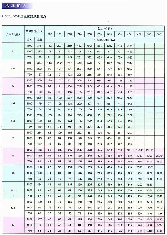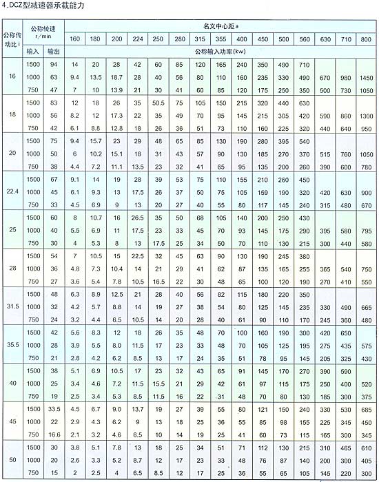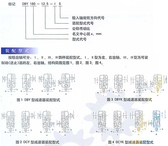 概述 圓錐圓柱齒輪減速器(以下簡稱減速器),用于輸入軸與輸出軸呈垂直方向布置的傳動裝置。主要用于帶式輸送機(jī)及各種運(yùn)輸機(jī)械,也可用于煤炭、冶金、礦山、化工、建材、輕工、石油等各種通用機(jī)械的傳動機(jī)構(gòu)中。該產(chǎn)品具有承載能力高、噪音低、體積小、重量輕、效率高、使用壽命長等優(yōu)點(diǎn)。 型號標(biāo)準(zhǔn) 減速器的型號由型式代號,名義中心距a(末級中心距),公稱傳動比,裝配型式代號,輸入軸旋轉(zhuǎn)方向代號組成。 D一帶式輸送機(jī)類組代號,B一二級傳動,c一三級傳動,Y一硬齒面齒輪,z一中硬齒面齒輪,K一輸出軸為空心軸形式。 名義中心距:用實(shí)際數(shù)字表示,單位為mm。 傳動比:用公稱傳動比表示。 裝配形式:用羅馬數(shù)字l、ll、…、jV表示。 輸入軸的旋轉(zhuǎn)方向:面對輸入軸方向看,s為順時(shí)針方向,N為逆時(shí)針方向。